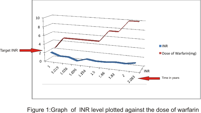Medications were adjusted over the months. Clopidogrel was withdrawn when she developed dyspepsia. Dabigatran 110 mg twice daily was added, with spironolactone 25 mg daily. On commencing dabigatran She developed hematuria with rise in blood pressure (systolic blood pressures of about 150 to 160 mmHg) probably related to stress of the hematuria, , so it was withheld and replaced with  warfarin 2.5mg daily, with adjustment according to sequential international normalized ratio (INR) records as depicted in the graph. She was educated on compliance but target INR was not achieved.