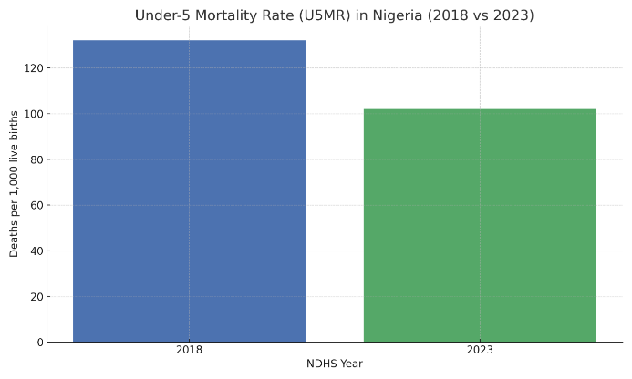 The comparative analysis of the Nigeria Demographic and Health Surveys (NDHS) from 2018 and 2023–24 illustrates a measurable improvement in child survival, particularly with regard to the under-five mortality rate (U5MR). According to the NDHS 2018, U5MR stood at 132 deaths per 1,000 live births. By the time of the 2023–24 survey, this figure had declined to 102 deaths per 1,000 live births. This represents an estimated 22.7% reduction over a five-year period a substantial gain within the Nigerian context where multiple socio-economic and health system challenges persist. The reduction, while encouraging, still falls short of the Sustainable Development Goal (SDG) 3.2, which aims to reduce U5MR to fewer than 25 deaths per 1,000 live births by 2030. Nevertheless, the downward trend provides evidence of gradual progress toward improving child survival outcomes in Nigeria. Multiple factors are likely responsible for this improvement. First, the expansion of routine immunization coverage across several regions of the country has likely contributed to lower child mortality. As detailed in related findings, increased coverage of vaccines such as DPT3, measles, and the pentavalent combination vaccine reduces susceptibility to common and often fatal childhood illnesses. Immunization has a proven effect not only in direct disease prevention but also in fostering broader health-seeking behavior among caregivers, reinforcing contact between families and healthcare providers.