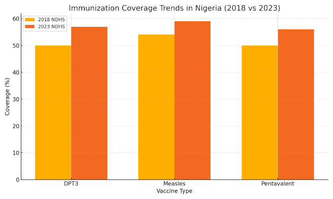 The trends in child immunization coverage in Nigeria, as captured by the 2018 and 2023 Nigeria Demographic and Health Surveys (NDHS), demonstrate a modest yet meaningful progression in the nation’s efforts to protect children from vaccine-preventable diseases. Over the five-year period, measurable gains were recorded across key immunization indicators. The coverage for the third dose of the DPT vaccine (DPT3) improved from 50% in 2018 to 57% in 2023. Similarly, measles vaccination coverage rose from 54% to 59%, while pentavalent vaccine coverage increased from 50% to 56%. These developments, while modest in scale, reflect a slowly strengthening immunization system responding to national and global pressure to reduce child mortality and morbidity.