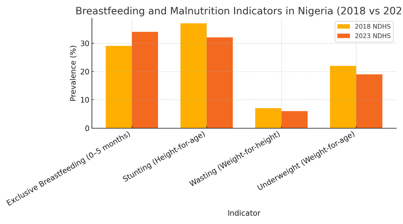 The results from the 2018 and 2023 NDHS reports reveal a mixed but encouraging picture in terms of infant feeding practices and child nutrition outcomes. Exclusive breastfeeding (EBF) for infants aged 0–5 months increased from 29% to 34%, a positive sign of growing adherence to WHO and UNICEF recommendations. Over the same period, the prevalence of child stunting declined from 37% to 32%, wasting decreased slightly from 7% to 6%, and underweight rates dropped from 22% to 19%.