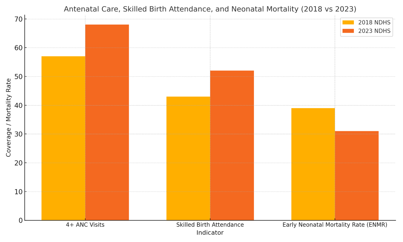 The growth in skilled birth attendance is another promising development. The shift from 43% to 52% between 2018 and 2023 suggests that more women are now giving birth in health facilities or are attended to by trained healthcare providers during delivery. Skilled attendance at birth is one of the most effective strategies for reducing both maternal and neonatal mortality, as it ensures the timely management of complications such as postpartum hemorrhage, birth asphyxia, and obstructed labor.